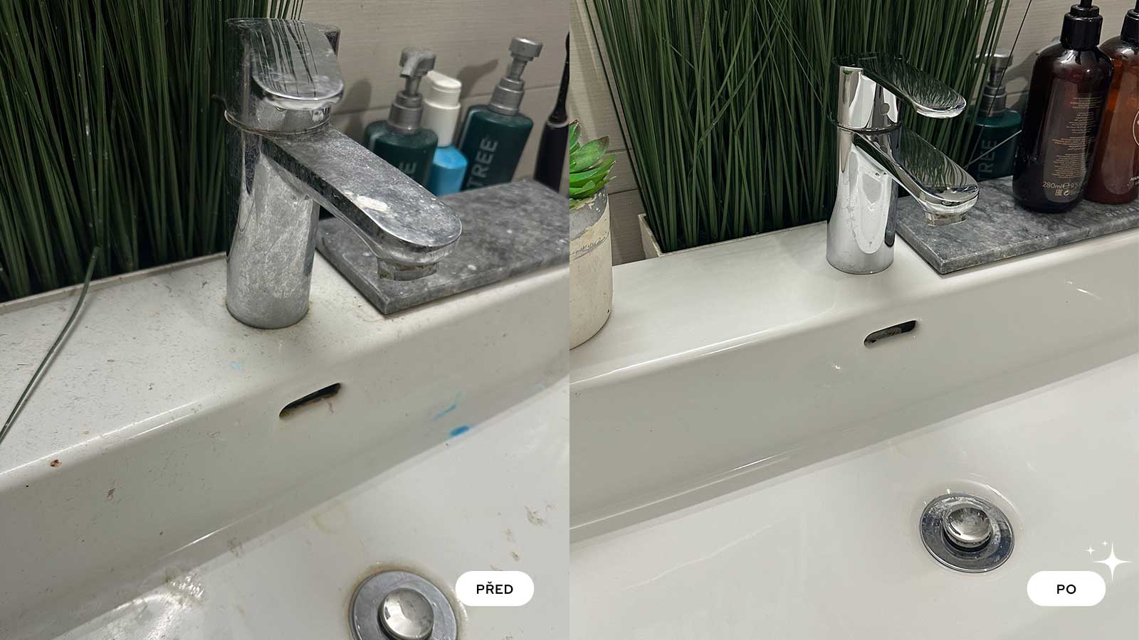 Detail koupelnového umyvadla a vodovodní baterie před a po důkladném vyčištění.