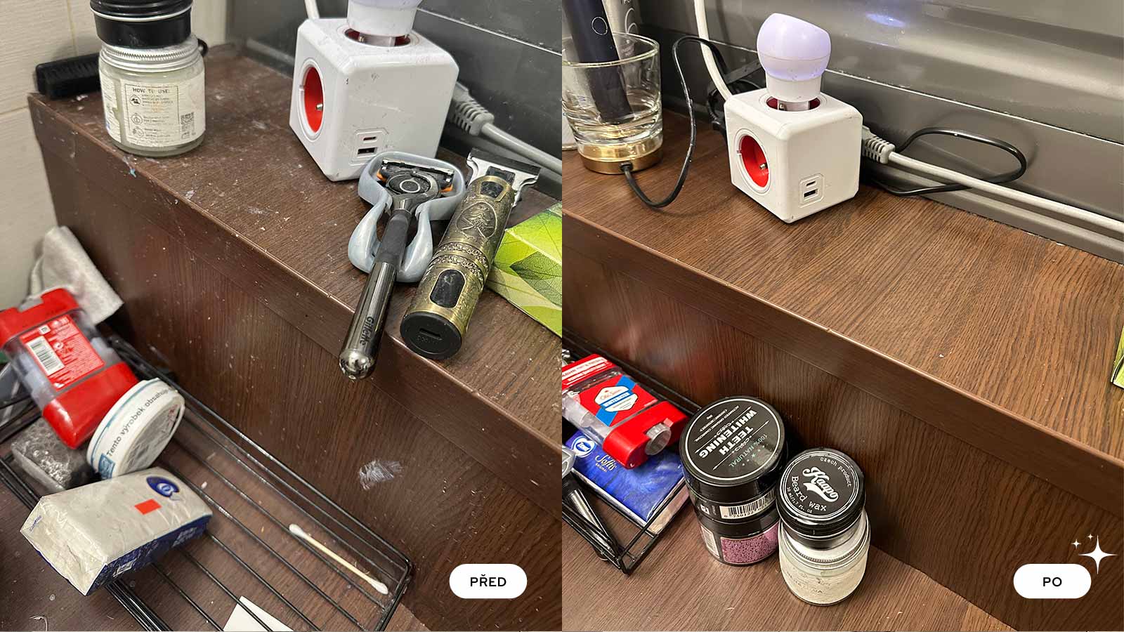 Koupelnová polička před a po vyčištění a uspořádání osobních věcí.