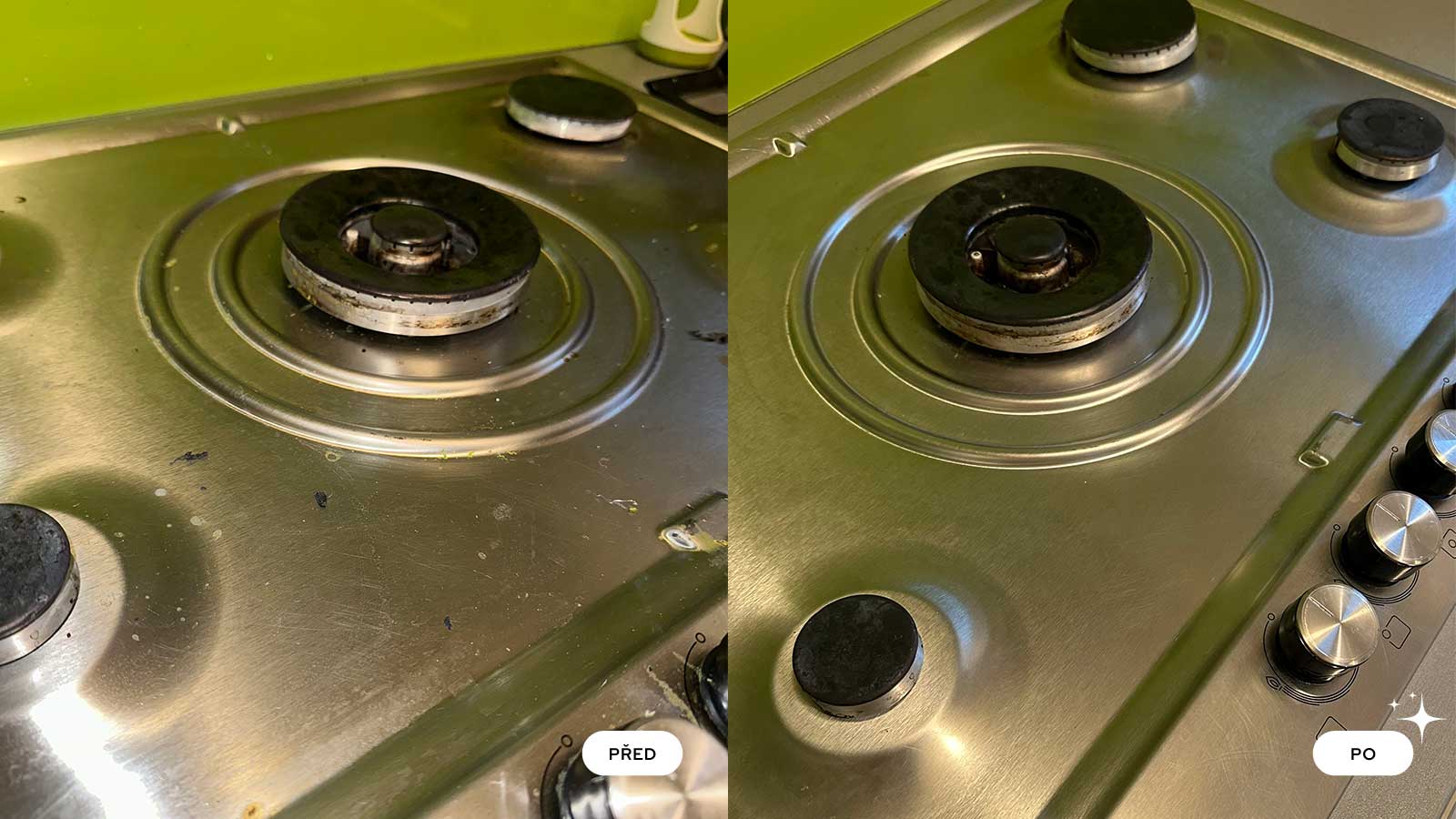 Detail kuchyňského sporáku před a po důkladném vyčištění.