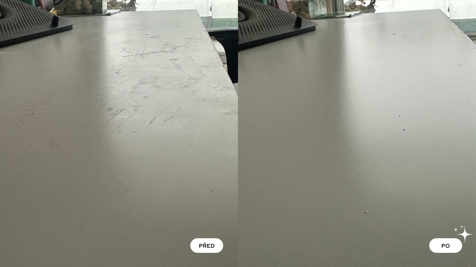 Povrch pracovního stolu před a po důkladném vyčištění a odstranění prachu.