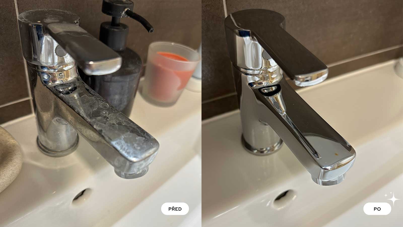 Detail umyvadlové baterie před a po důkladném odstranění vodního kamene.